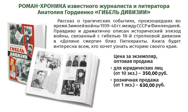 Роман-хроника известного карельского журналиста и литератора Анатолия Гордиенко "Гибель дивизии" - рассказ о трагических событиях, произошедших во время "зимней" войны 1939-40гг. между СССР и Финляндией. Исторический эпизод войны, связанный с гибелью 18-й стрелковой дивизии в "Долине смерти" близ Питкяранты, впервые в литературе показан правдиво и драматично.